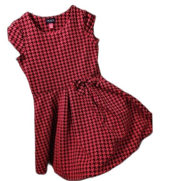 Keywords: houndstooth dress, the children's place, girls dress, red dress, fit and flare, party dress, school dress, holiday dress, short sleeve dress, xl 14, tween dress, classic pattern, gathered waist