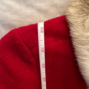 32” length 19” sleeve length. Cute wool and viscose coat. Fully lined. Warm knee length. No rips or stains on outside. 2 small black stains on inside lining. Dry Clean Only.
