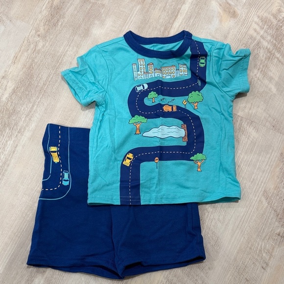 Charming pajama set with a city road theme. Teal top with navy shorts. Ideal for playful nights.