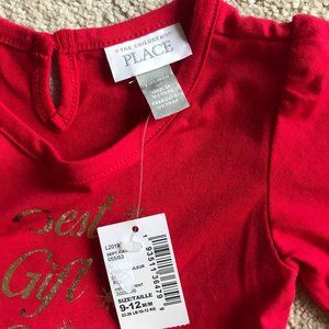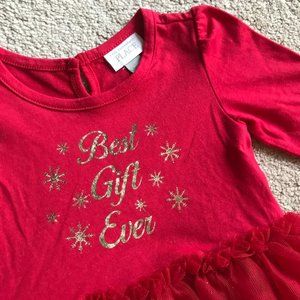 The Children's Place tool holiday dress. Long sleeves. Red with metallic gold cursive writing that says "Best Gift Ever." Snap onesie closure on bottom.