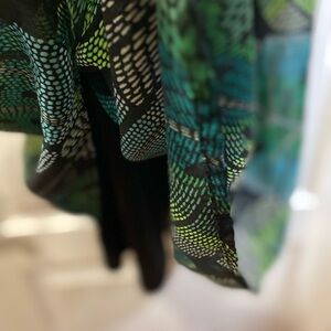 Charming dress with a vibrant tropical leaf pattern dress. Features shades of green on a black background. Perfect for any occasion.