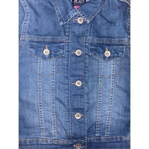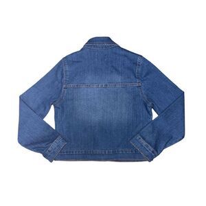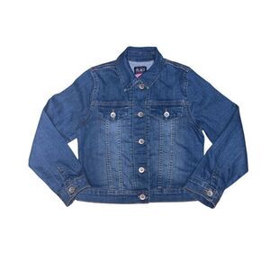 Blue button front Jean jacket. Collared. Faux chest pockets with flap and button. Cotton/polyester/spandex. Size: 7/8. Preowned in good condition.