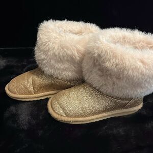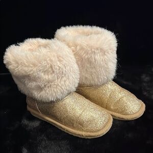 Stylish and cozy kids boots in shimmering gold with a soft cream fur lining. Perfect for keeping little feet warm and fashionable! Gently used, like new condition.