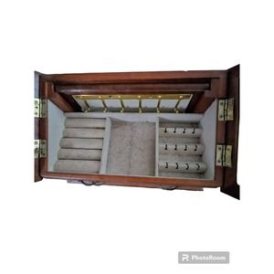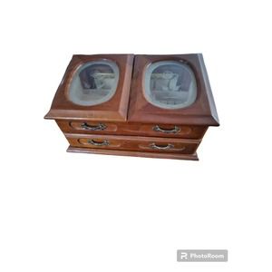 The Commodore vintage wooden jewelry box. This jewelry box has room for all of your different jewelry and has 1 drawer. In overall good condition but does show some signs of wear.