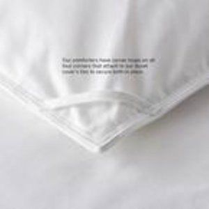 Comforter’s corner loops attach to duvet cover’s ties to secure both in place