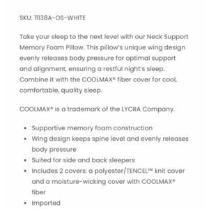 • Take your sleep to the next level with our Neck Support Memory Foam Pillow. This pillow’s unique wing design evenly releases body pressure for optimal support and alignment, ensuring a restful night’s sleep. Combine it with the COOLMAX® fiber cover for cool, comfortable, quality sleep.