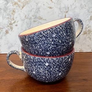 Set of 2 mugs. Blue speckled look with red top/ring around the lip. Each cup holds 12oz. Ceramic mugs in excellent condition. Neither mug shows chips or cracks, and handles show no signs of breakage or regluing.