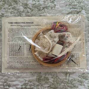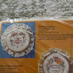 Create a charming wall decor piece with The Creative Circle #1940 Wedding Rings Kit. Featuring elegant white lace and colorful embroidery. Kit includes flosses, lace, ribbon, thread, wooden hoop, needle and instructions. Perfect for adding a personal touch to your home. Unopened original package.
