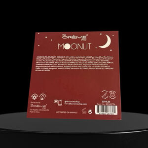 The Crème Shop Moonlit 9-color eyeshadow palette features a red-to-purple gradient cardboard case with holographic "MOONLIT" text and a crescent moon design. It contains nine square pans of eyeshadow in various matte and shimmer finishes, including shades like "Stardust," "Eclipse," and "Black Hole." The palette opens to reveal a mirror on the lid and states "ultra-pigmented, multi-finish, long-wear, vegan, cruelty-free." Net weight is 0.49 oz. / 14.1 g. Item number EPM8736. The item appears new.