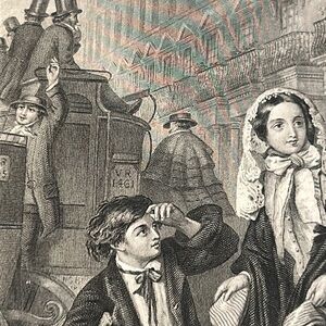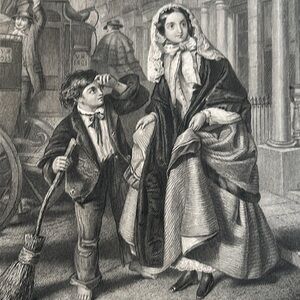 Exterior scene of a young boy (the "crossing sweeper") with a beautiful young woman on the streets of a city with a carriage and large building behind them. Beautiful details in the fashion, architecture and expression on faces.