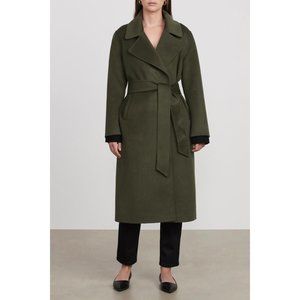 100% wool in forest green, this coat has now been discontinued. Purchased in 2021 and worn lightly. Great condition and timeless piece! Some of the photos just show the same cut in a different color