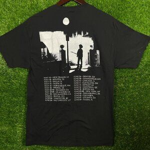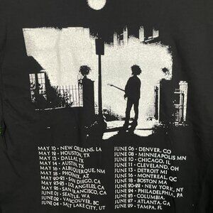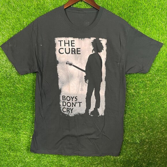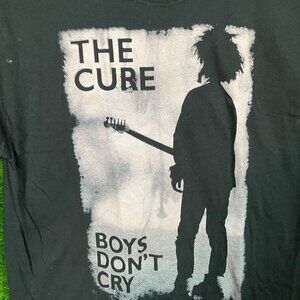 This large Cure rock T-shirt is a must-have for fans, measuring 18 inches pit to pit and 27 inches long. Made from soft material, it's comfortable, durable and perfect for casual wear.
