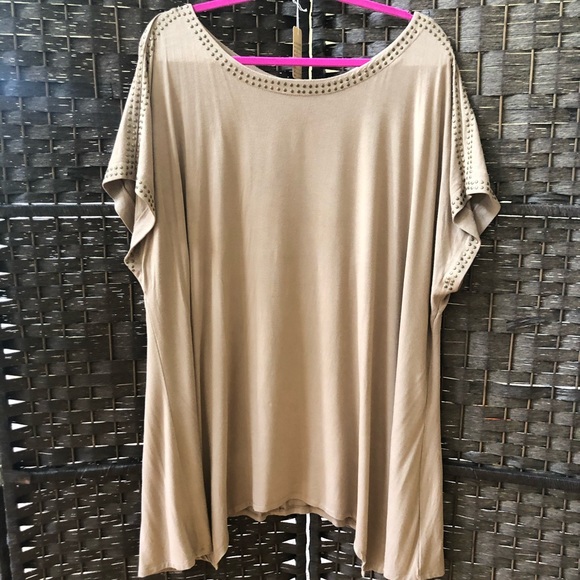 Studded collar and sleeves with swoop neck. Beautiful on.