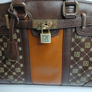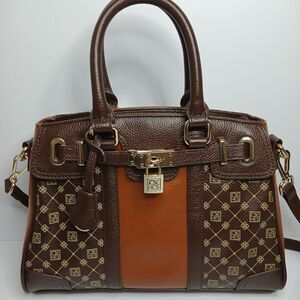 This Venetian satchel-style bag is made of genuine leather and features Jose Hess' signature design against a dark espresso background. It is beautifully complemented by a rich cognac center and side panels. Gleaming gold-tone hardware provides striking accents, including a belted accent strap and matching lock. The fully lined interior boasts multiple zippered pockets and a full-zip enclosure to keep valuables secure, while a detachable, adjustable shoulder strap provides extra versatility. A handy leather key fob is a thoughtful finishing touch. The Bag is EUC, however the wallet is in fair condition. Please reference photos for details.
