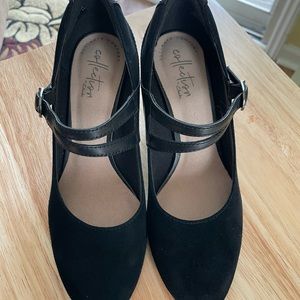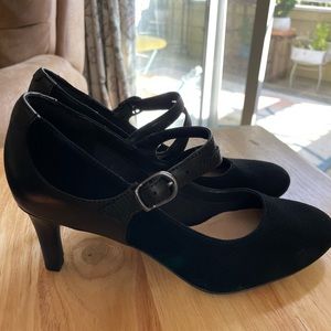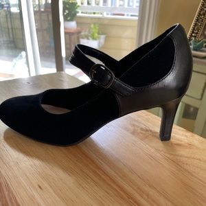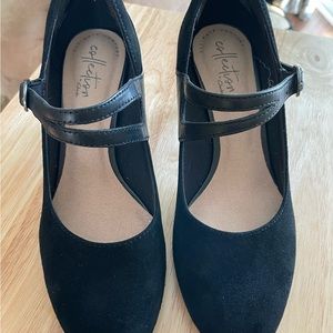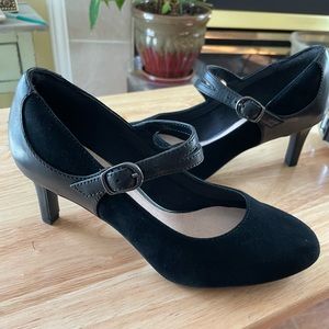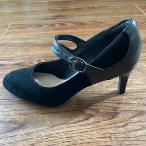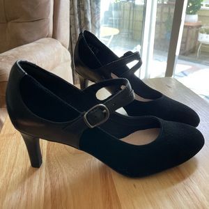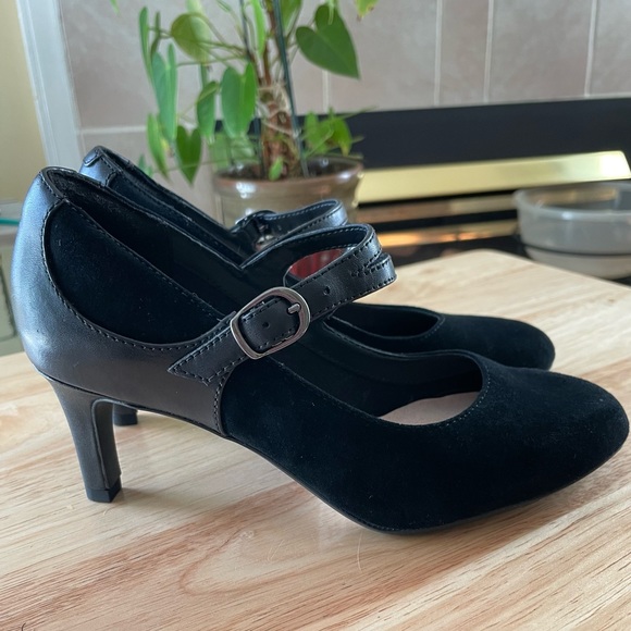 A contrasting suede and leather upper brings a modern twist to the mary jane heel. The dancer Reece by Clarks collection features an elegant buckle strap to create a personalized fit, while the ortholite footbed provides support and comfortability. The durable rubber outsole and cushion soft padding bring ease and flexibility to every step.