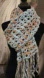 This elegant crochet scarf features a beautiful blend of blue and tan colors, perfect for adding a touch of sophistication to any outfit.