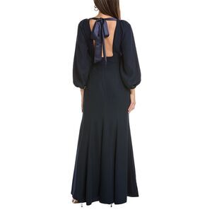 Color/pattern: midnight navy Approximately 62in from shoulder to hem Model is 5'10 and is wearing a size 4. Measurements may vary slightly by size. Design details: balloon sleeves, slit at hem Center back zipper with hook-and-eye closure 100% polyester Machine wash Imported