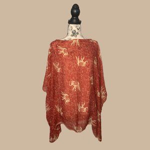 This "The Devine Depot" top is a flowy and sheer top. It's extremely comfortable are easy to throw on top add a pop of design and color to any outfit. It is red with tan elephants distributed throughout. EUC.