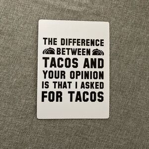 New. “The Difference Between Tacos 🌮 and Your Opinion is that I Asked for Tacos” magnet. 5.5x4”. Strong enough to hold photos and notes. Bundle to get a discount.