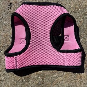 Comfortable pink dog harness with black trim. Features a secure buckle and reflective strips.