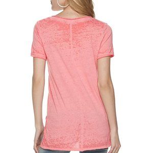 Give your look a stylish edge with this women's Rock & Republic® tee from The Doors. High Lo hemline. 45% Cotton, 55% Polyester. Check photos for double exposed stitching for neck line, sleeves, and hemline.