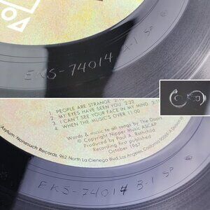 The Doors Strange Days vinyl record from 1976 (EKS-74014, (Specialty Records Corporation pressing). Matrix/runouts: EKS-74014 A-1 SP, EKS-74014 B-1 SP. Minor wear does not affect playback. Plays through with wonderful sound. Please note original record paper sleeve not present, and a modern day high quality one is in place.