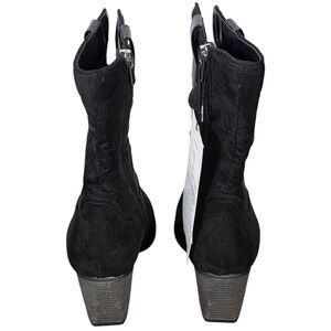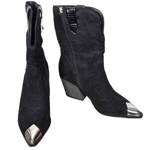 Step out in style with these chic black Western ankle boots. Featuring sleek silver accents, these boots are perfect for any occasion. Pair them with your favorite outfit for a bold look.