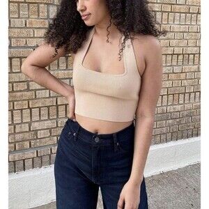 The Drop Women's Greta Fitted Square-Neck Halter Sweater Bralette in Ginger, size M, is a stylish and comfortable crop top perfect for travel and casual occasions. Made from a blend of nylon, spandex, and viscose, this bralette features a solid beige color and a square neckline with a halter strap for a chic look. The pullover closure and stretch material make it easy to wear and care for, while the sleeveless design and regular fit make it a versatile piece for various seasons.