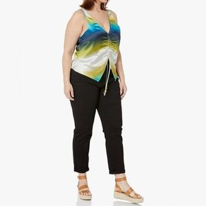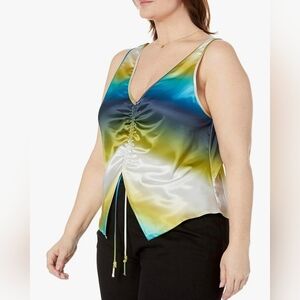 This sleeveless camisole features a vibrant blue and green ombré effect, enhanced by a ruched center and tie front detail. Its design and silky fabric make it perfect for summer outings or parties.