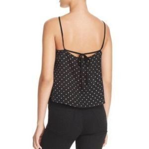 This camisole tank top by Revolve brand The East Order features a silver metallic star print on a black background. Lace up front detail. Adjustable spaghetti straps with tie in back. Fully lined. Fit is loose in a shorter.