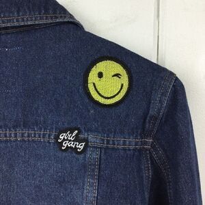 The Edit by Seventeen - Distressed Blue Denim Jacket. Size Medium (Juniors). Button- up denim jacket w/brass colored buttons & gold top stitching. Distressing on back & patches all over: Fries before guys, rainbow, lips, girl gang, smiley face, lightning, diamond. 80% cotton, 20% polyester. Excellent condition with no holes or stains.