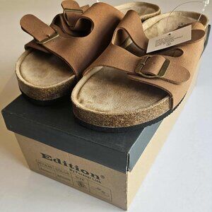 NEW!! The Edition Cork Footbed Sandal for Women in size 8 is a stylish and comfortable sandal designed specifically for women. With a flat heel and straps for support, these sandals are perfect for everyday wear. The cork footbed provides added comfort and cushioning, making them ideal for all-day wear. The brand focuses on creating high-quality footwear for women, ensuring a perfect fit and lasting durability. Whether you're running errands or meeting friends for a casual outing, these sandals are a versatile and chic choice.