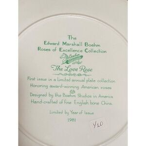 First issue in a limited annual plate collection Honoring award-winning American roses Designed by the Boehm Studios in America Hand-crafted of fine English bone China.