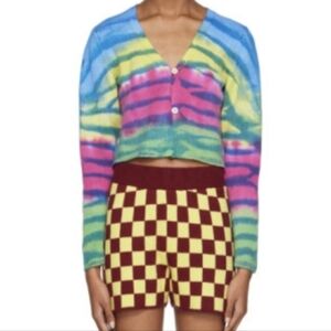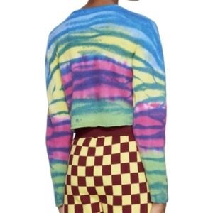 Excellent preowned condition 100% cashmere Multicolor Frank Cardigan from The Elder Statesman. Brushed knit cashmere cardigan. Hand-painted tie-dye pattern throughout. Neon rainbow tie dye color way. 2 buttons. Blue, pink, yellow, green with blue zebra stripe pattern. Clean. No flaws or signs of wear, this cardi looks and feels brand new!