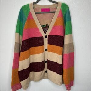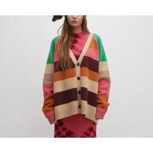 The Elder Statesman Tan Burgundy Pink Orange Green Blue Multi Color Striped Front Button V-Neck Yoga Enlightened Bear Cashmere Cardigan Sweater Jumper Oversized relaxed.