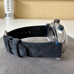 The Stone Z is an invitation to explore the infinity of space, dressed in a Tuxedo. Mysterious and quiet, only the dial’s Thunder-blue illuminates the GUN metal shades of the moon surface. The original LED backlighting has 5 LEDs, for ultimate night-vision in all situations. The Stone Z sharp features are further underlined by its blue suede leather strap. Endless is the universe, timeless is The Stone Z.