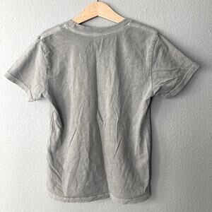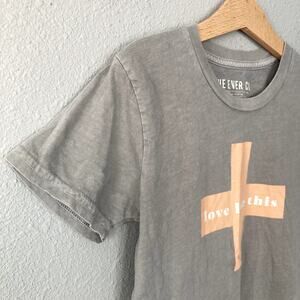 Small shop short sleeve crewneck t-shirt in a washed grey with peach cross / plus sign and the words love like this. Super soft, intentionally washed / distressed look. Muted or neutral for Valentine's Day!