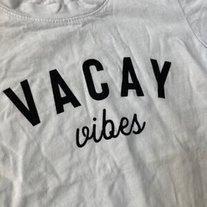 Solid white short sleeve t-shirt with the words Vacay Vibes on the front in black. Crewneck.