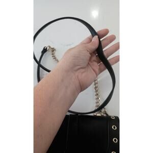 The Express black crossbody embellished with big cute bow,metal eyelet grommets adorn the edges of the closure flap. Snap shut. Inside has area for cards and some storage. Long strap for comfortable carrying as a crossbody faux leather and chain juxtaposition on the strap used once in excellent condition 7.5 * 7.5 in.