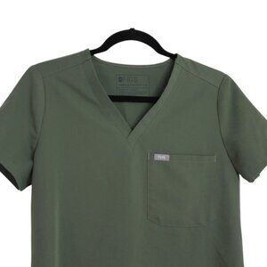 The FIGS Women Technical Collection V-Neck Front Pocket Moss Green Scrub Shirt in size Xtra Small