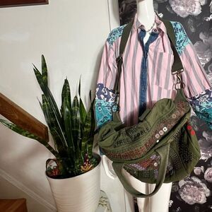 An FP exclusive with The Falls, this so slouchy and military-inspired tote bag is featured in an unstructured silhouette and soft cotton fabrication with eye-catching antique brass sequins, a top zip closure, and adjustable shoulder strap.