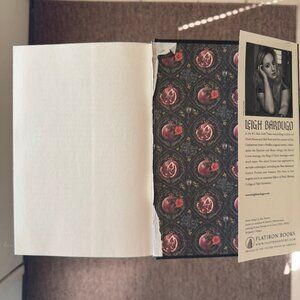 Hardcover, 2024. Gothic, magical realism/historical fiction novel by the author of the Hell Bent and Shadow & Bone series. Black sprayed edges all the way around. Beautiful gothy pomegranate patterned art inside the covers. Good condition, but the front and back pages appear to be torn out as shown. Does not affect the necessary pages.