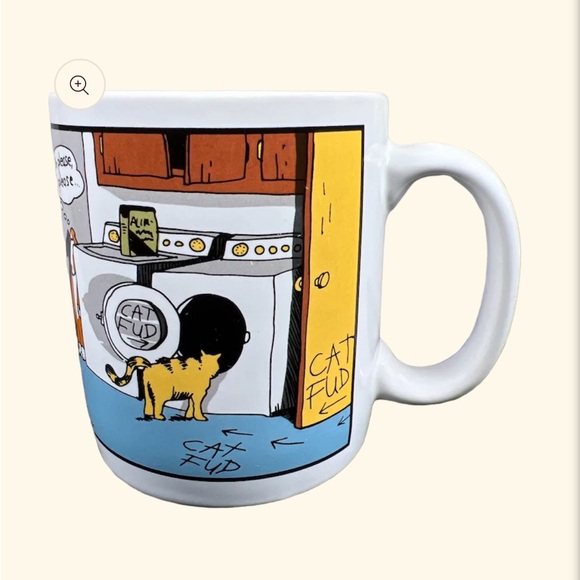 The Far Side Gary Larson Cat Fud Mug OZ Vintage 1985 Features a colorful comic strip design. Perfect for fans of the classic cat.🐈 Features the same image on its front and rear surface consisting of a cat looking in a dryer. "CAT FUD" is written on the glass in the dryer door. Towards the left side of the washing machine there is a dog hiding and thinking: ā€œoh pleaseā€ The mug has no chips, cracks, scratches, stains or crazing. Original box included. See all photos! -Vintage. Like new. -Height (in): 3.7 -Diameter (in): 3.3 -Material: Ceramic -Year: 1985 -Exterior Color: Artwork/White -Interior Color: White -Dishwasher Safe: Unknown -Microwave Safe: Unknown