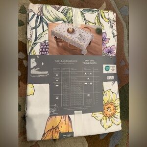 Beautiful floral tablecloth by The Farmhouse. Features vibrant floral patterns on a white background. Perfect for adding a touch of nature to your dining space.