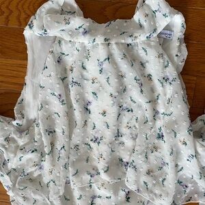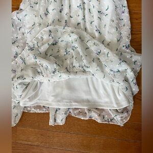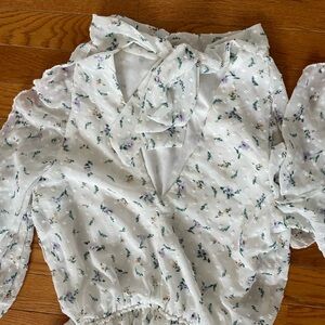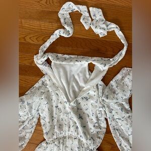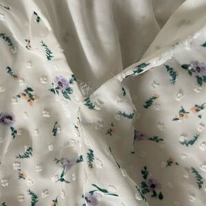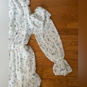 This whimsical dress with dreamy bare shoulders is even cuter in person. The fabric is light and airy with tiny flowers and perfectly layered for feminine charm. It has a tie neck in the back and long attached sleeves with ruffles around the wrists.