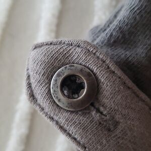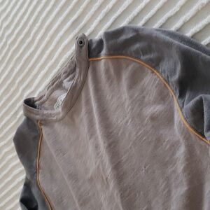 The Field Raglan pullover, size M. Grey with charcoal sleeves and orange striping at sleeve. Button closure at neck. gently worn, 9/10 condition.