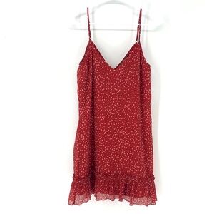 Channeling retro vibes with a modern twist, this fiery red mini dress is all about playful polka dots and seductive elegance. A V-neckline to turn heads, adorned with spaghetti straps that are pure luxury. And that ruffle hem? Total showstopper. The perfect blend of cheeky and chic. Embrace your inner Vixen. π