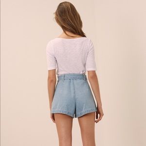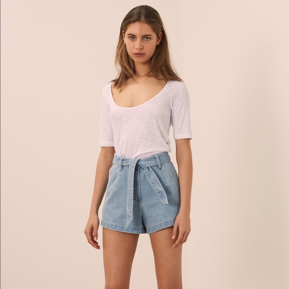 These shorts are high waisted and a light blue wash. They have front side pockets and no back pockets. There is an attached matching belt. These shorts are so cute and comfortable!