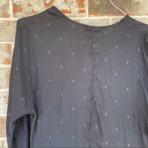Pretty silky feel lightweight diamond - printed top! Deep V cut neckline with a surplice wrap top style, fathered and flowy at the bottom. Bubbly blouson in front, hanging tunic long in the back.