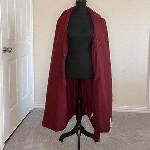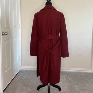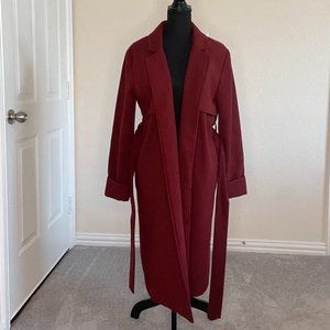 The Fifth Label Women's Belted Trench Coat (elongated peacoat) in Maroon (Deep Red) in size Medium. Fashioned with storm flaps, cuffed sleeves and a belted waist. Featuring a notched lapel collar, two (2) vertical wide welt pockets, a single back vent, and lining. Provides a relaxed, yet polished look with a midi-length silhouette, ensuring warmth, style, and comfort.